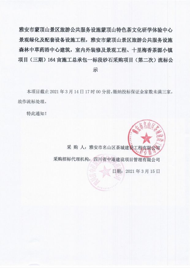 雅安市蒙頂山景區(qū)旅游公共服務(wù)設(shè)施蒙頂山特色茶文化研學(xué)體驗中心景觀綠化及配套設(shè)備設(shè)施工程,雅安市蒙頂山景區(qū)旅游公共服務(wù)設(shè)施森林中草藥浴中心建筑,室內(nèi)外裝修及景觀工程、十里梅香茶源小鎮(zhèn)項目(三期)164畝施工總承包一標段砂石采購項目(第二次)流標公示